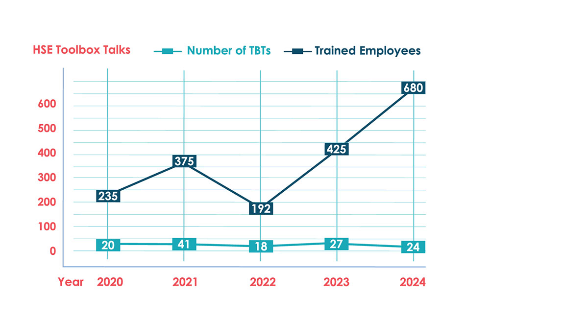 To lessen risks and to be more target oriented towards specific operating groups, the company holds small group HSE Toolbox Talks (TBTs) to inform employees about task-specific hazards.